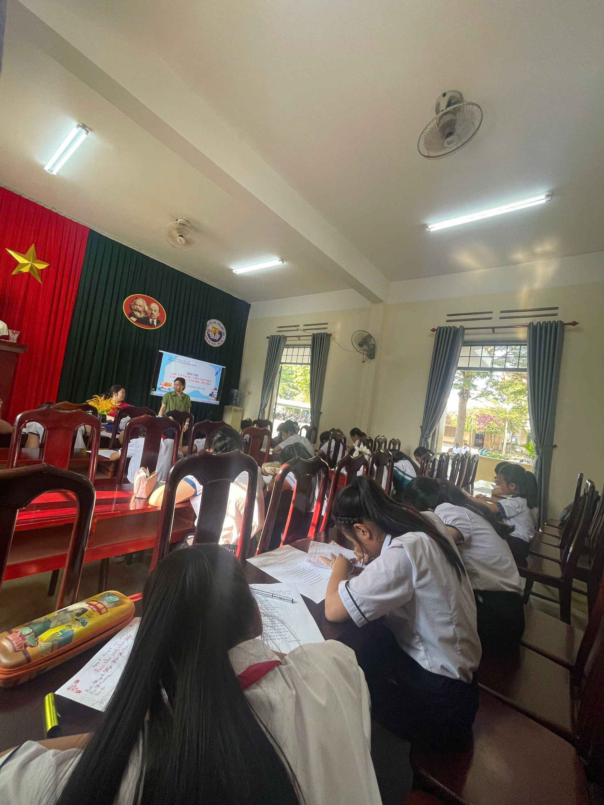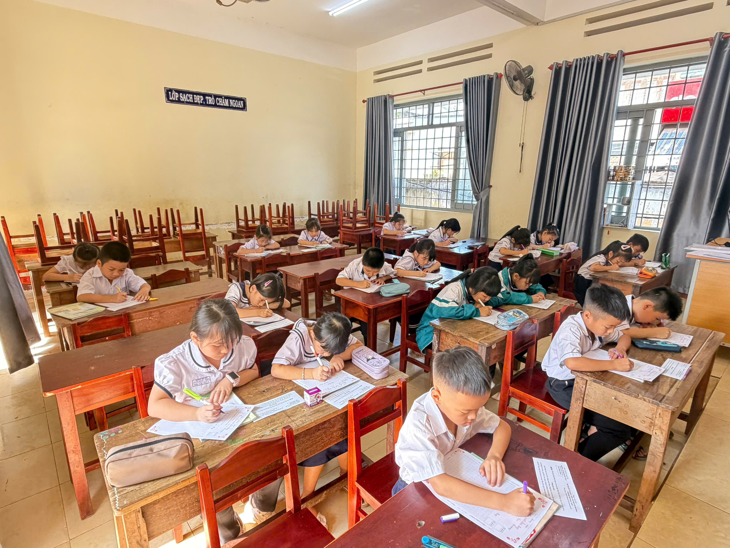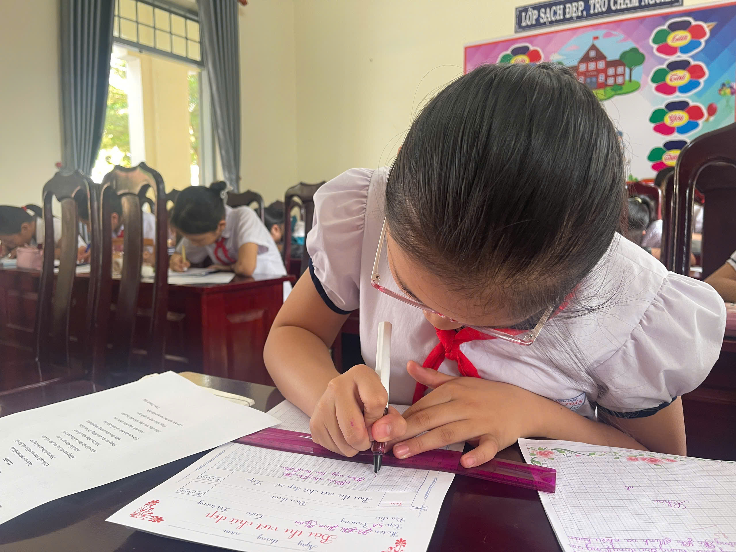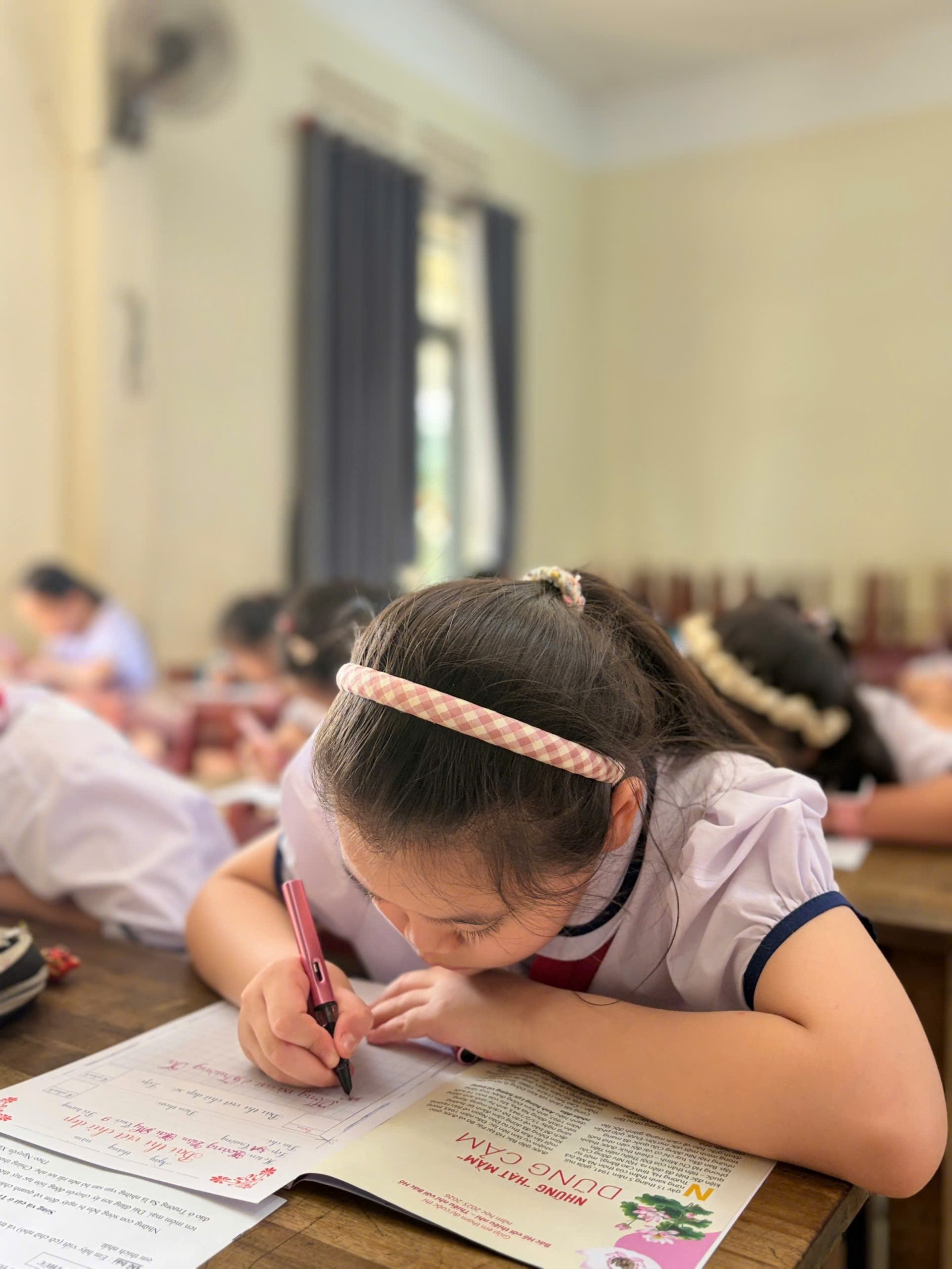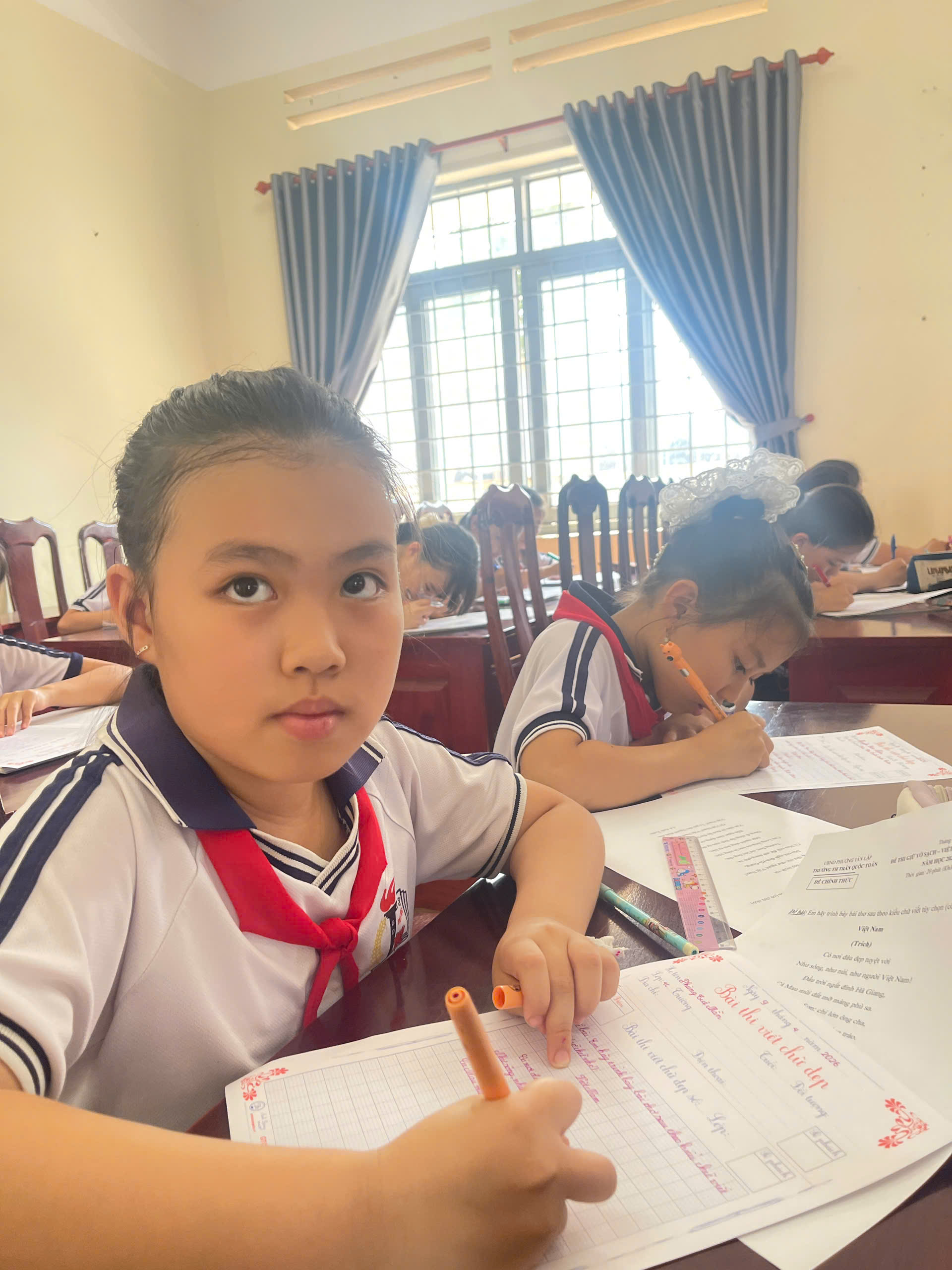 Giữa nhịp sống hiện đại của kỷ nguyên số, việc cầm cây bút, nắn nót từng nét chữ vẫn mang một vẻ đẹp diệu kỳ và tĩnh lặng. Bước vào phòng thi, ta như lạc vào một thế giới của sự tập trung cao độ. Ở đó, các em học sinh không chỉ viết chữ, mà đang gửi gắm cả tâm hồn mình vào từng dòng thơ, đoạn văn.