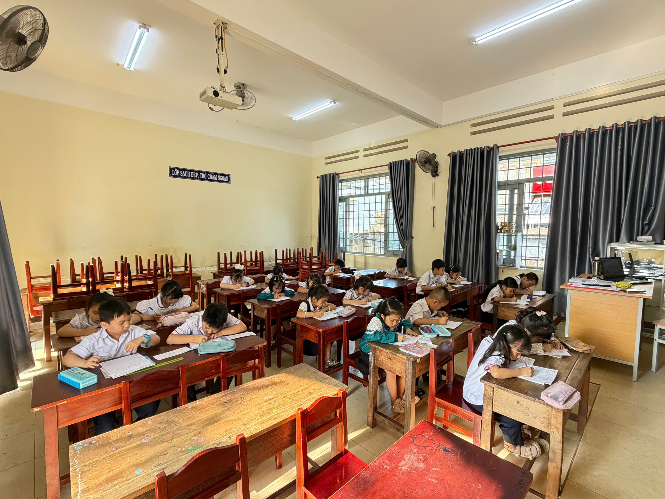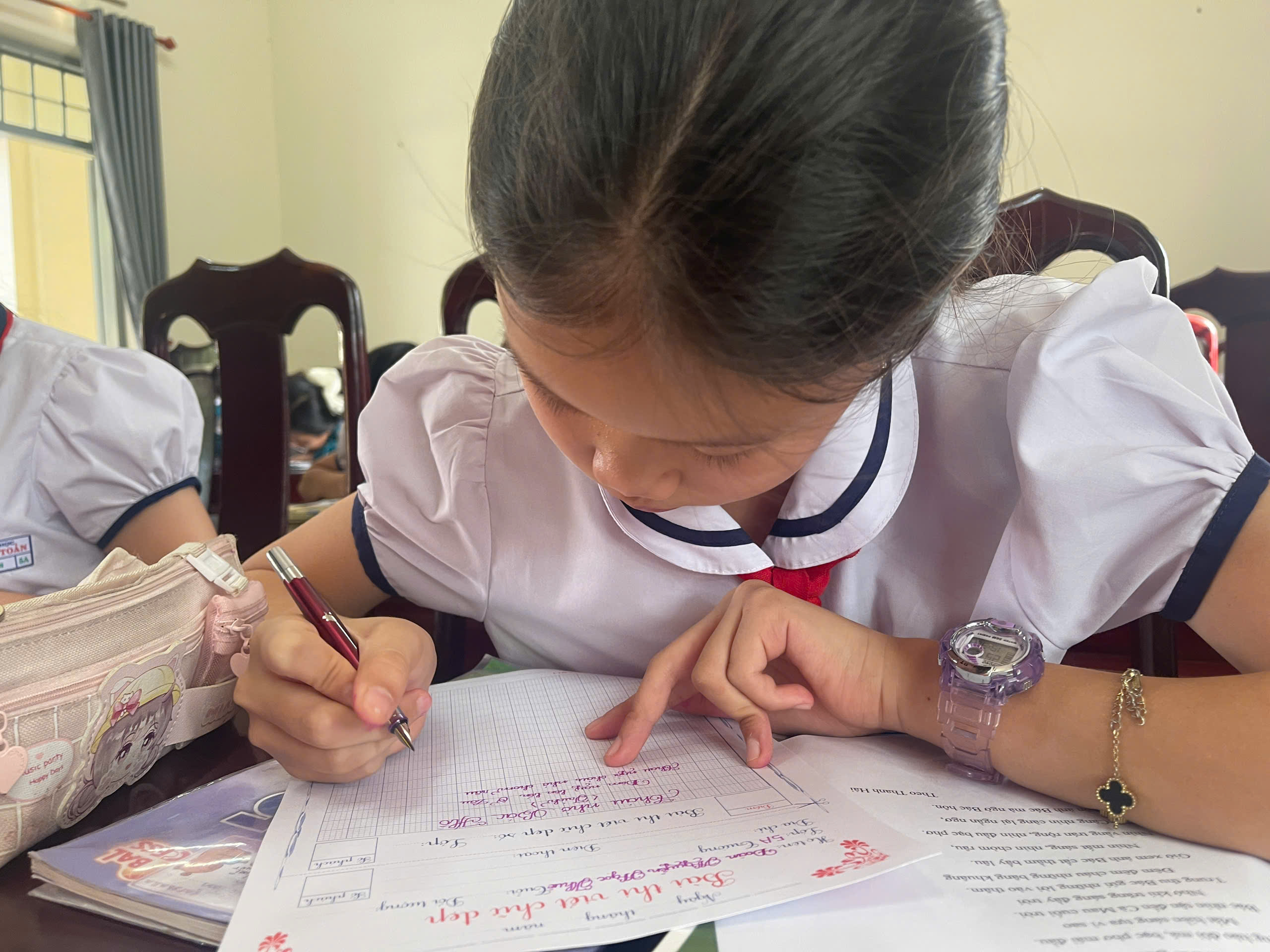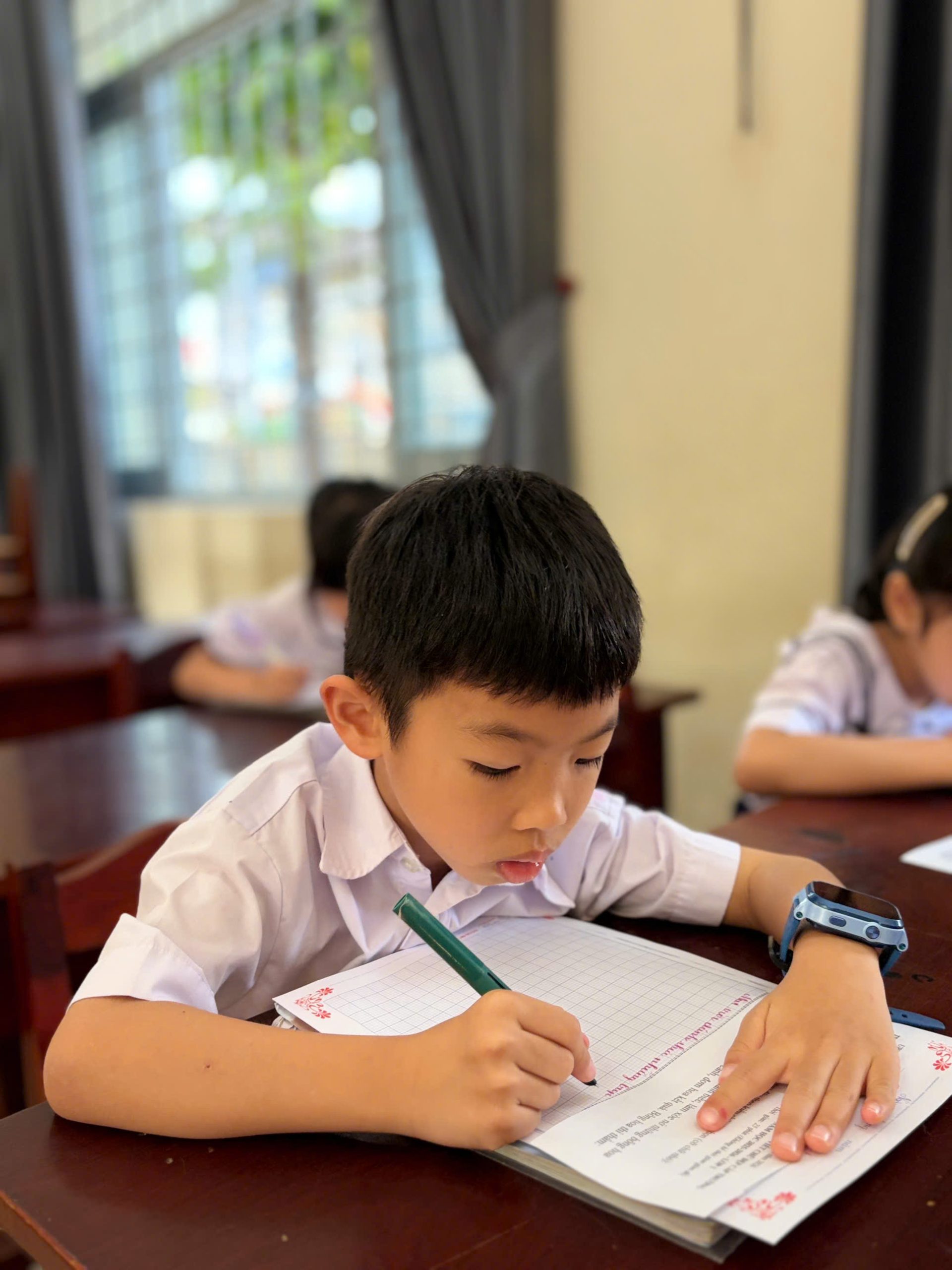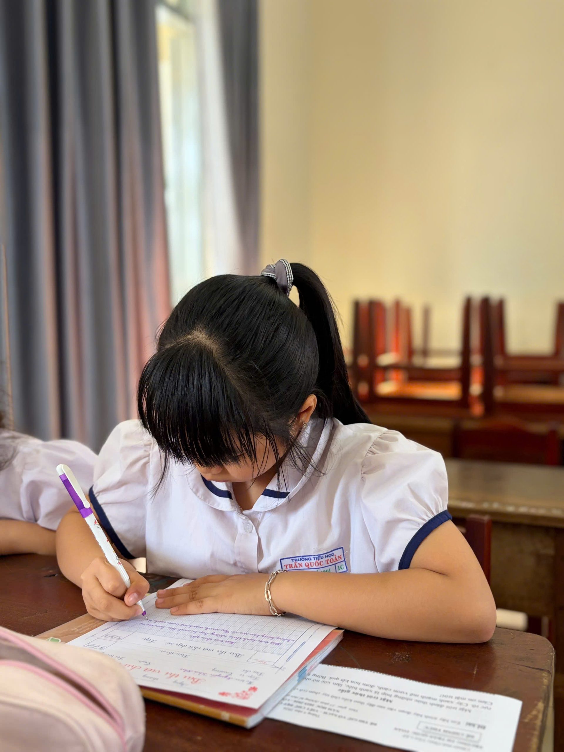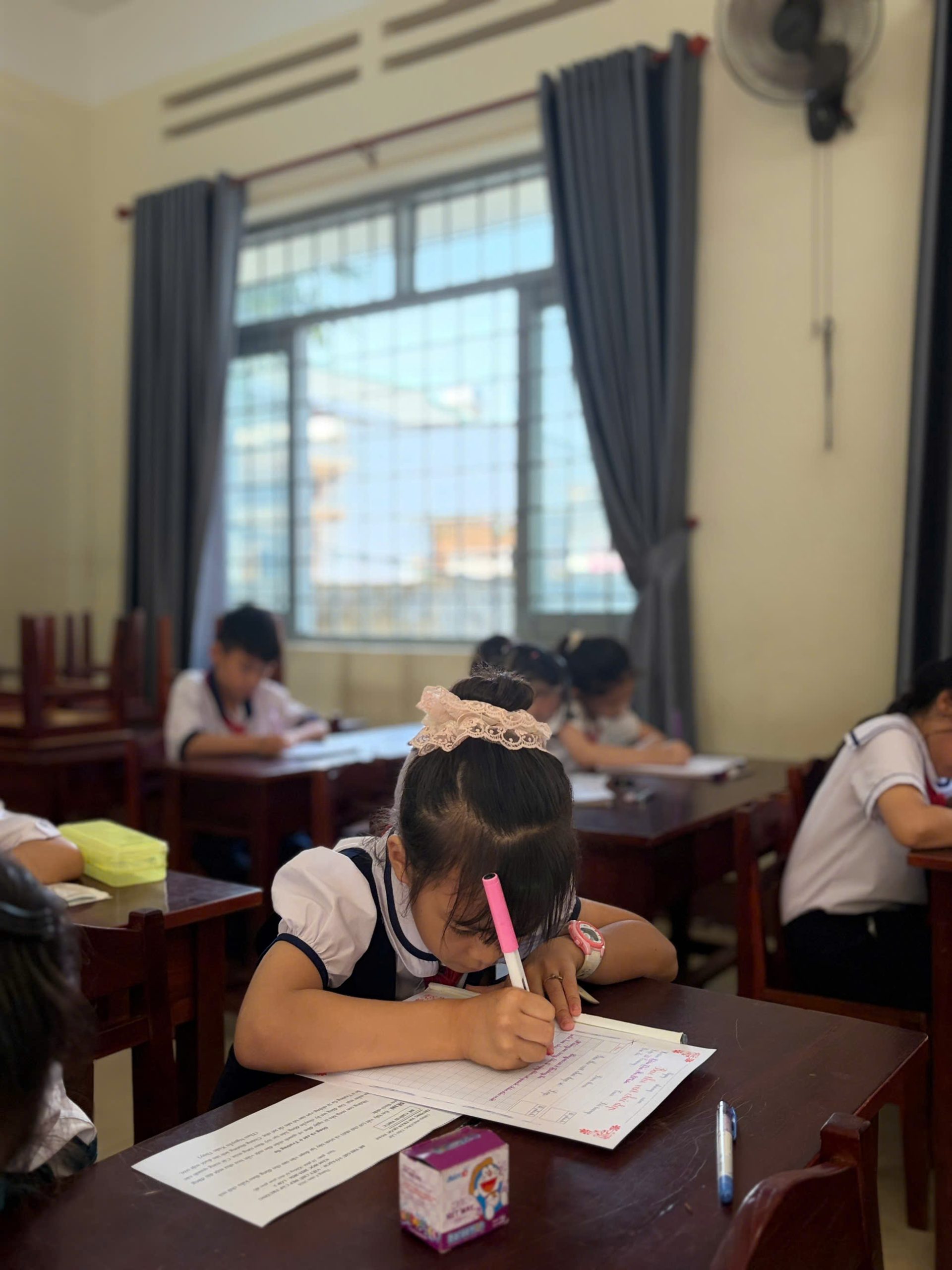 Giữa nhịp sống hiện đại của kỷ nguyên số, việc cầm cây bút, nắn nót từng nét chữ vẫn mang một vẻ đẹp diệu kỳ và tĩnh lặng. Bước vào phòng thi, ta như lạc vào một thế giới của sự tập trung cao độ. Ở đó, các em học sinh không chỉ viết chữ, mà đang gửi gắm cả tâm hồn mình vào từng dòng thơ, đoạn văn.