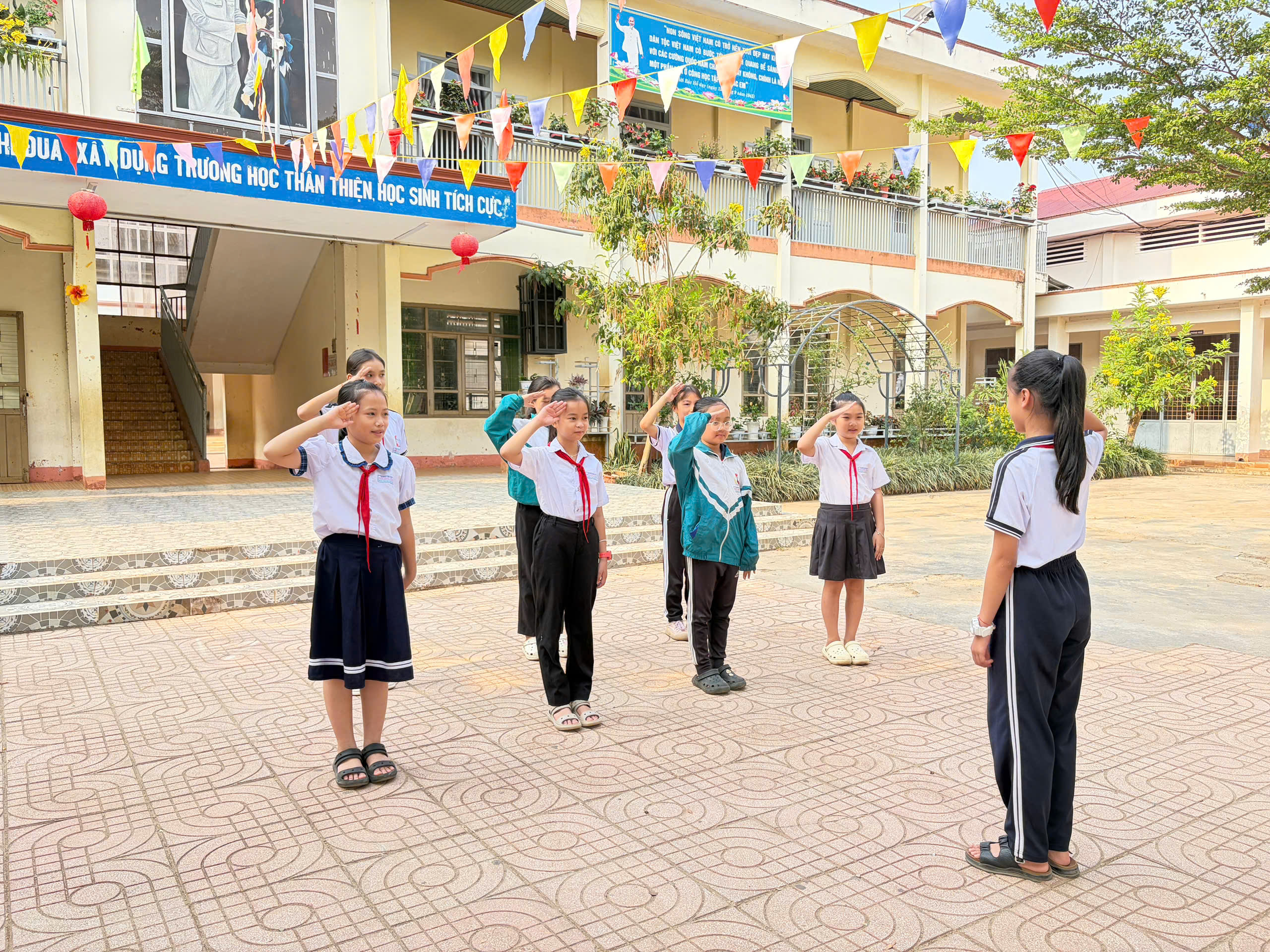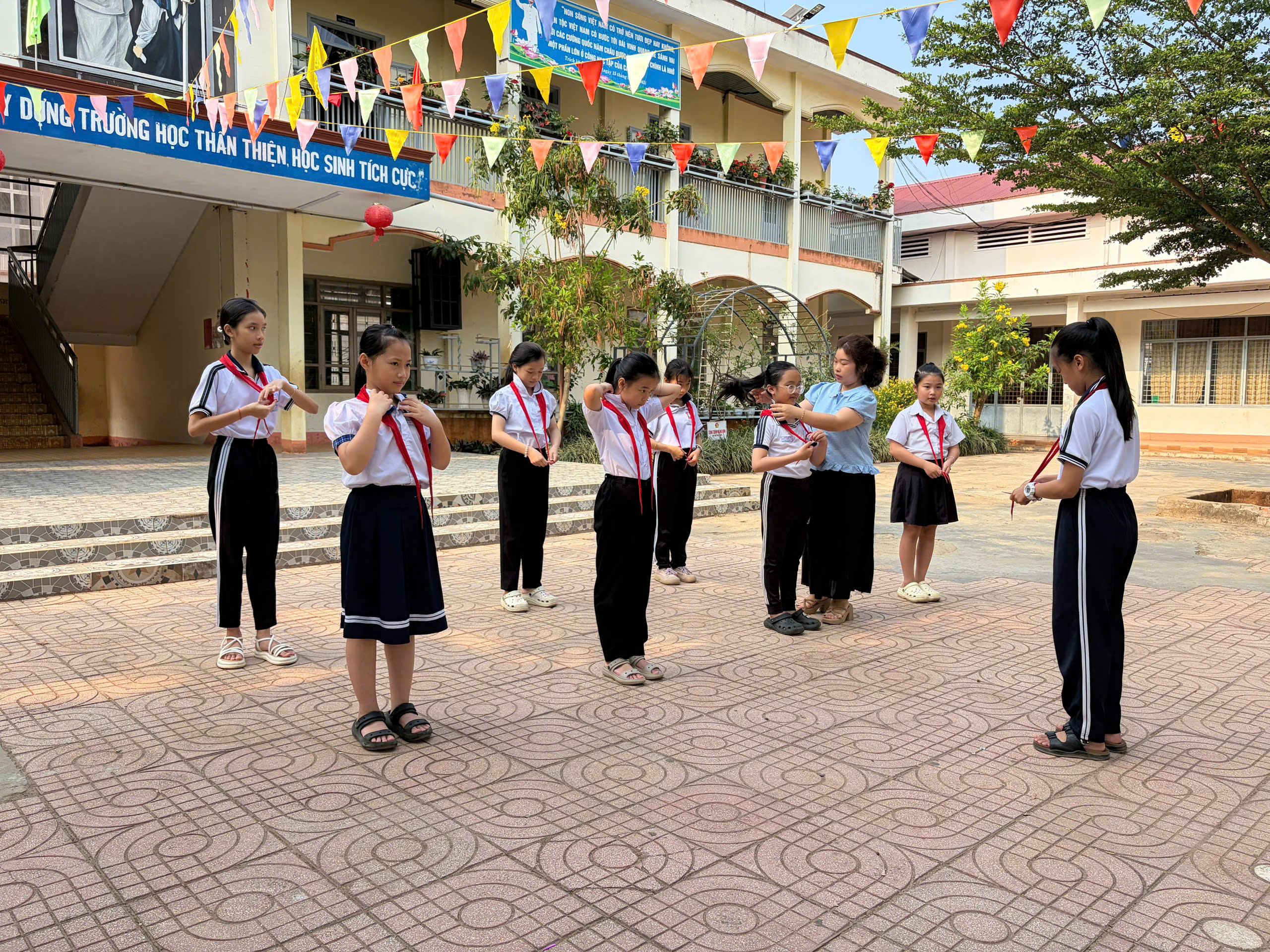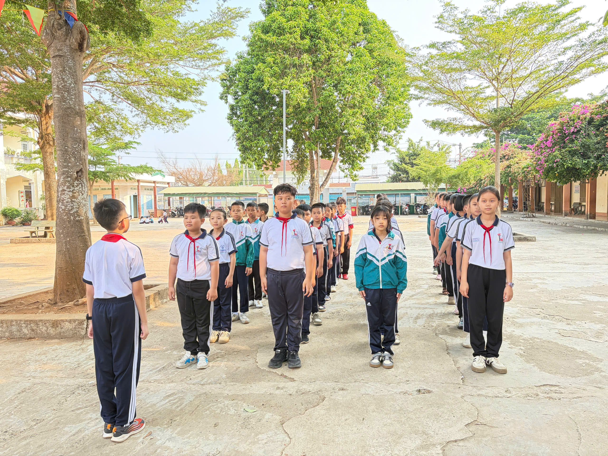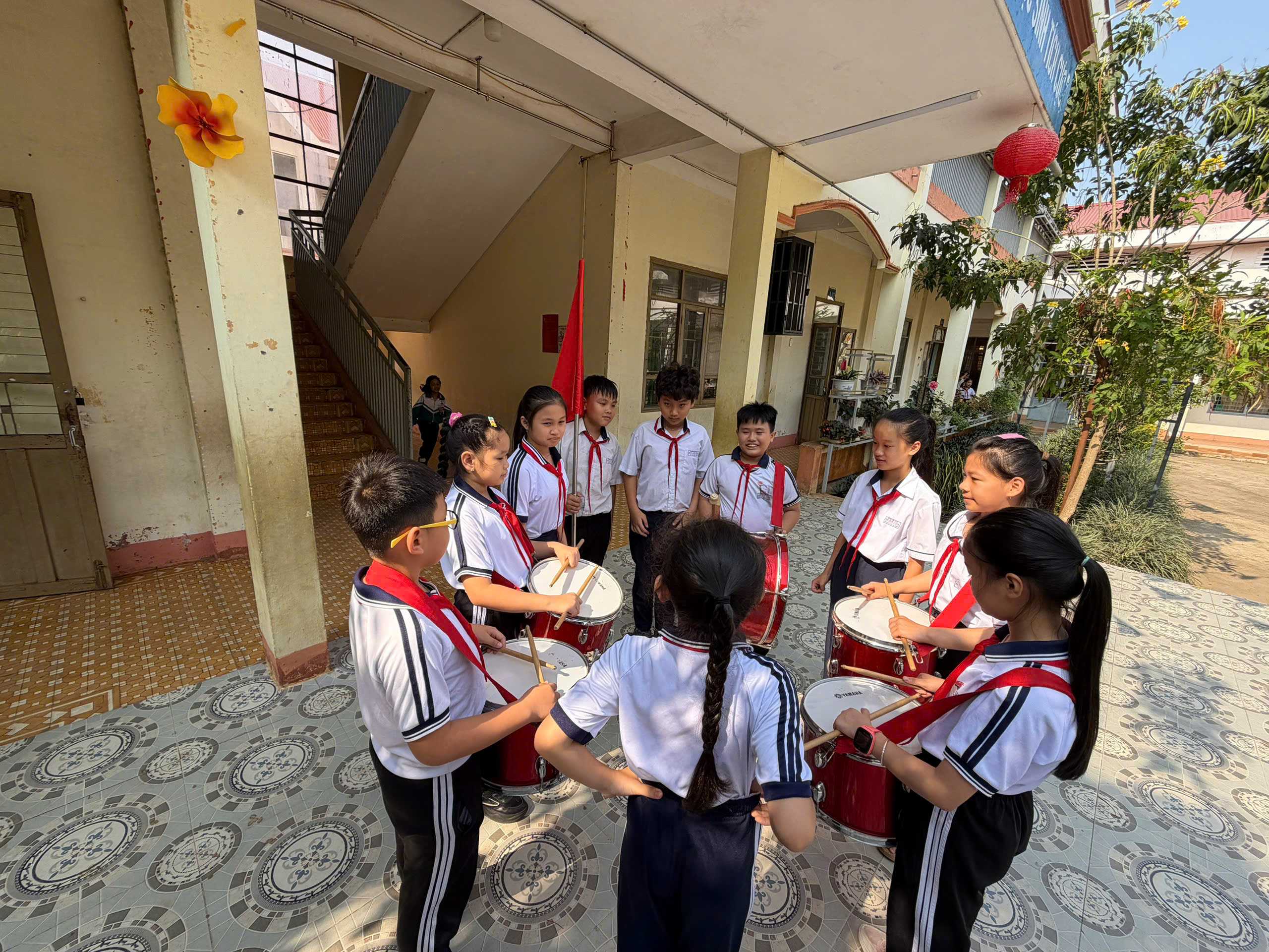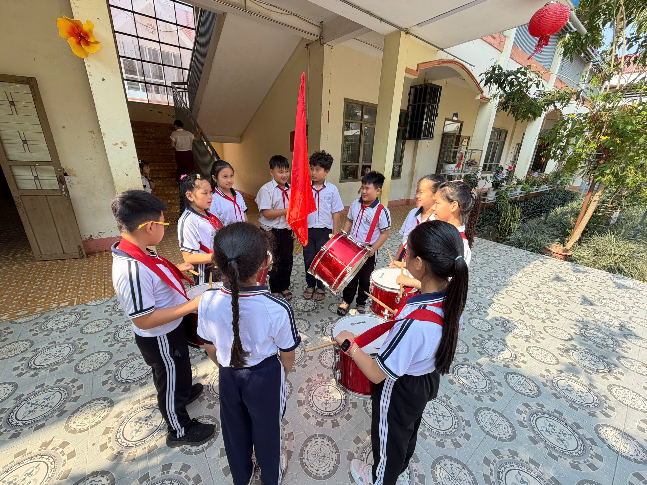 🇻🇳 Nghi thức Đội chuẩn mực: Ôn luyện các động tác cá nhân tại chỗ và di động, cách thắt – tháo khăn quàng đỏ. Tiếng trống Đội vang lên giòn giã khi các em thực hành các bài trống quy định (Chào cờ, Hành tiến, Chào mừng).