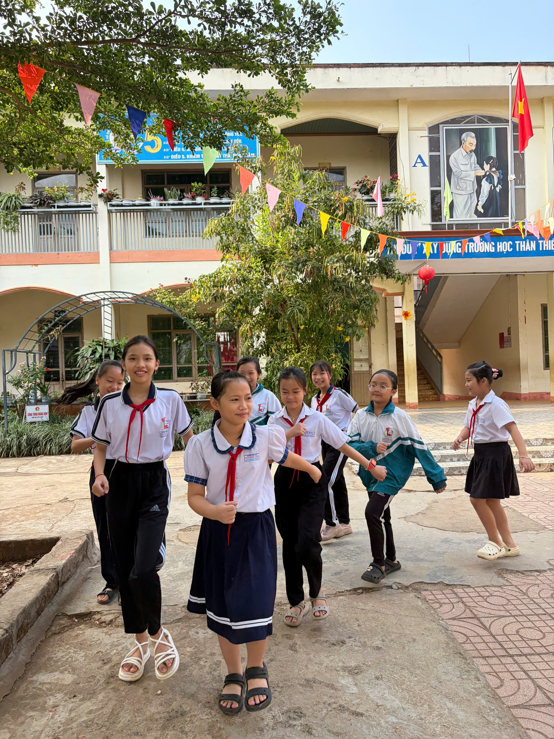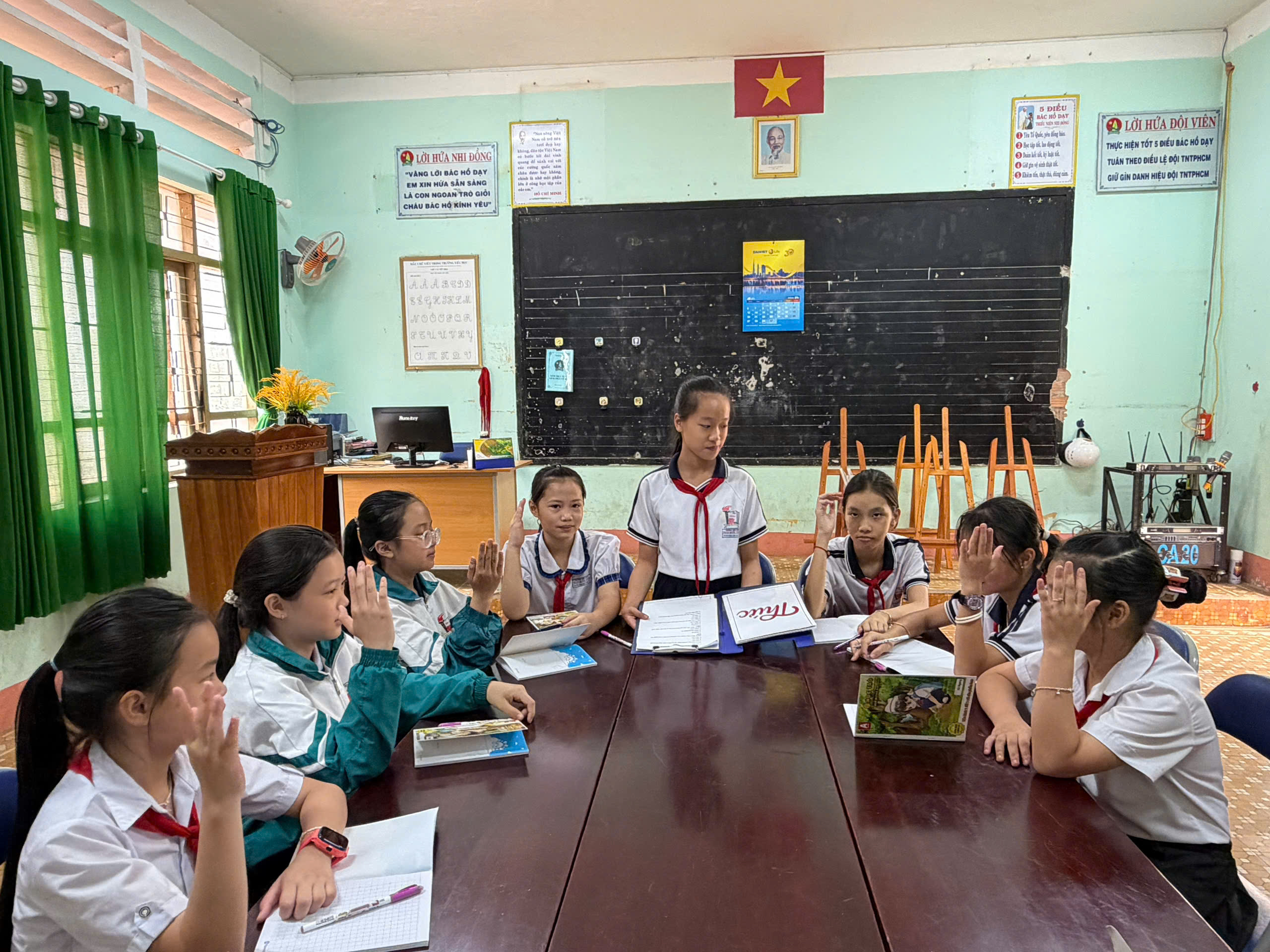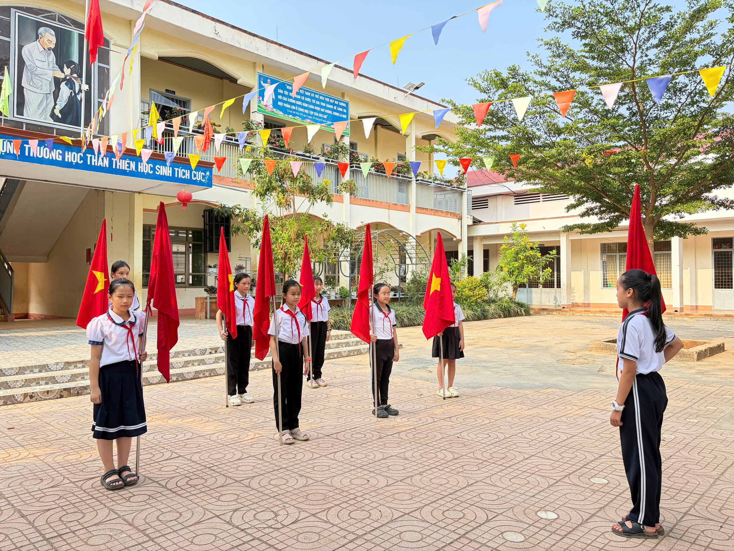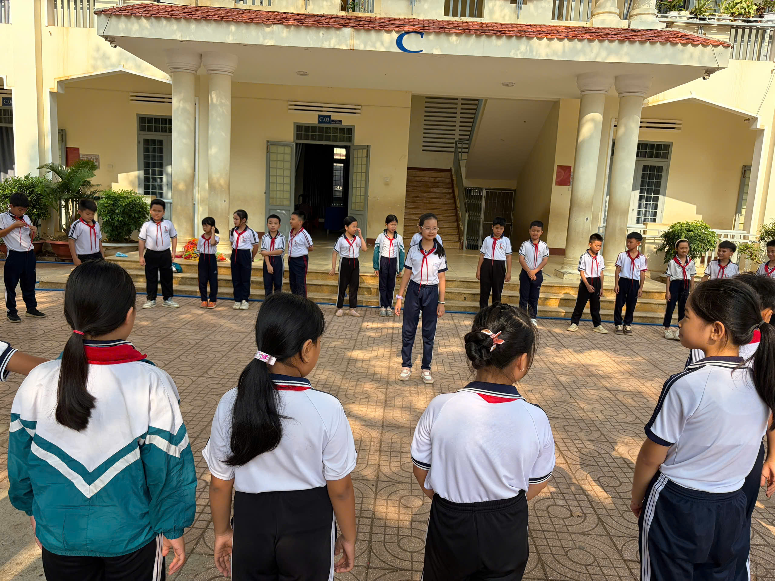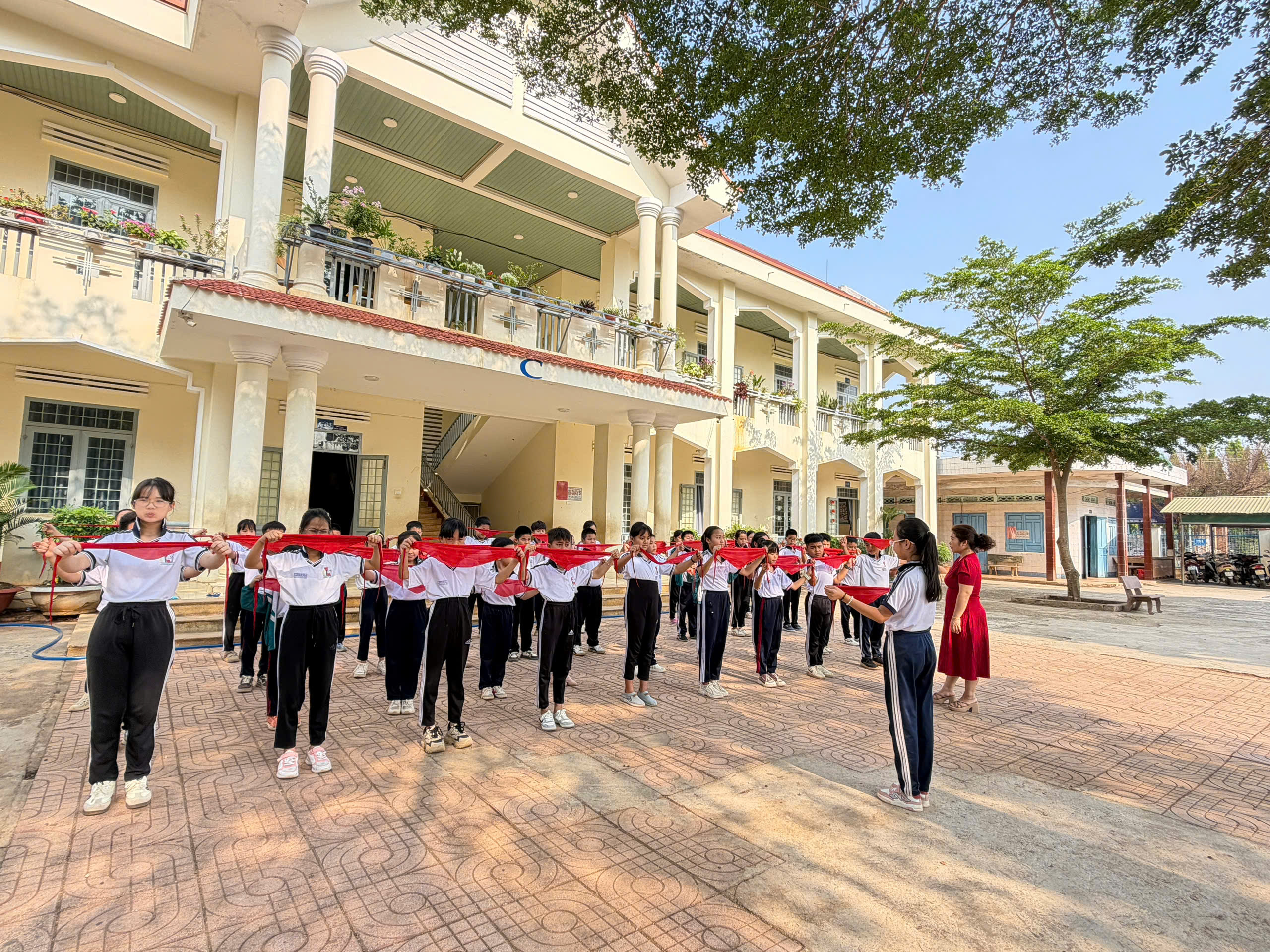 🇻🇳 Nghi thức Đội chuẩn mực: Ôn luyện các động tác cá nhân tại chỗ và di động, cách thắt – tháo khăn quàng đỏ. Tiếng trống Đội vang lên giòn giã khi các em thực hành các bài trống quy định (Chào cờ, Hành tiến, Chào mừng).